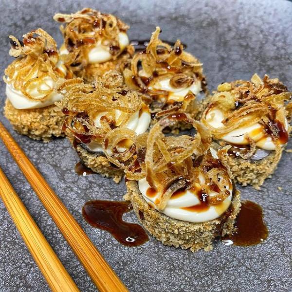 6 hot filadelfia com cream cheasse e crispy de cebola da casa.