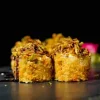 Hot empanado com farinha panko super crocante, recheado com salmão, cream cheese e finalizado com crispy de couve crocante e molho tarê.