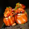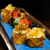 Hot empanado com farinha panko super crocante, recheado com salmão e cream cheese, finalizado com camarão, crispy de batata doce e molho tarê.