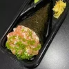 Atum, arroz, cream cheese envolto em alga, finalizado com cebolete.