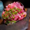 Salmão, pele de salmão crocante, arroz e cream cheese envolto em alga, finalizado com molho tarê e palha doce.